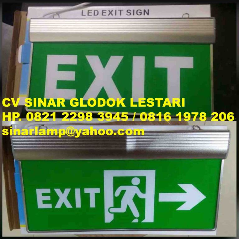 Lampu Emergency LED Exit adalah lampu emergency exit led mika model gantung dengan kualitas terbaik, menggunakan lampu LED dan battery emergency slim dengan acrylic tebal tapi sangat ringan, lampu tetap menyala bila listrik PLN padam, bacaan exit atau legend gambar orang lari, gambar 2 sisi bolak balik, sangat mudah dalam pemasangan, biasa di pakai untuk tanda arah keluar dari suatu gedung.